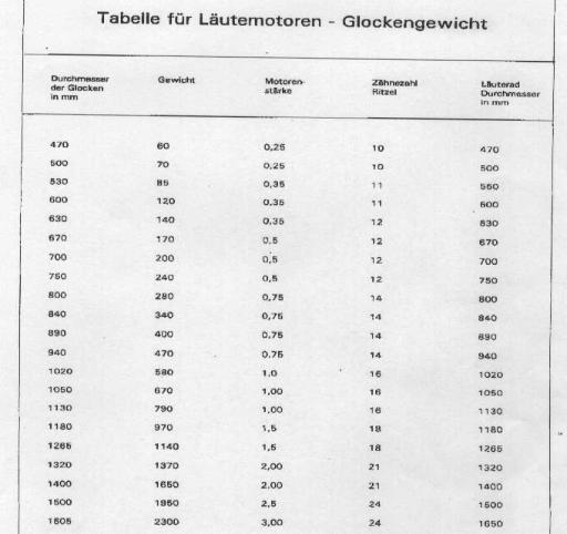 Hinweis: Die Motoren sind in ihrer Stärke etwas überdimensioniert, um ein schnelleres Anläuten zu produzieren, was aber nicht sein muß. Daher kann man von der tatsächlich benötigten Leistung rund 30